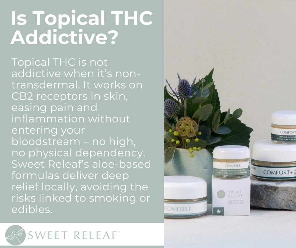 Topical THC is non-psychoactive and unlikely to be addictive because it doesn’t enter the bloodstream, unless formulated as a transdermal.