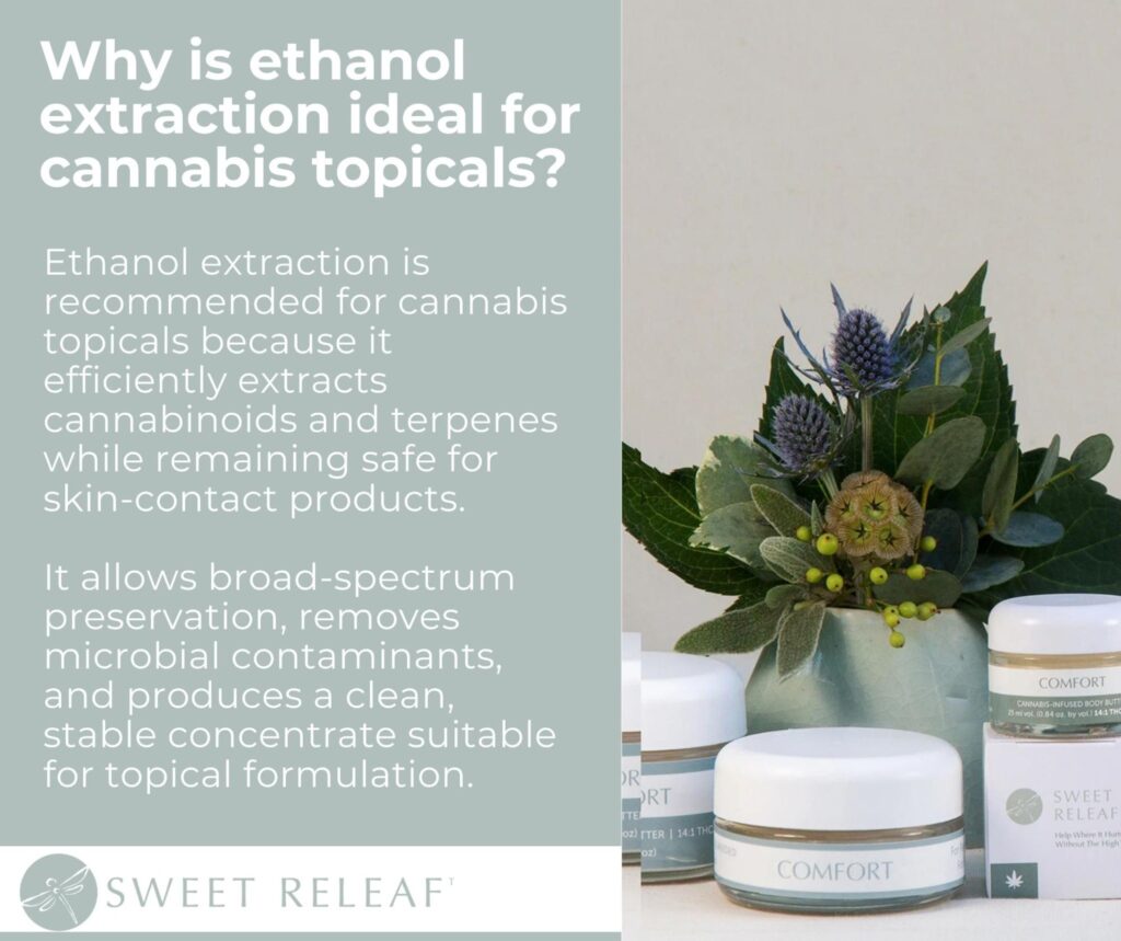 More quality-minded manufacturers like Sweet Releaf use ethanol extraction, where food-grade alcohol washes over the plant material to dissolve cannabinoids and terpenes. The alcohol is then evaporated, leaving behind a concentrated extract. Depending on how it is handled afterward, this process can preserve a broad range of plant compounds or be further refined to remove waxes, lipids, and minor constituents.